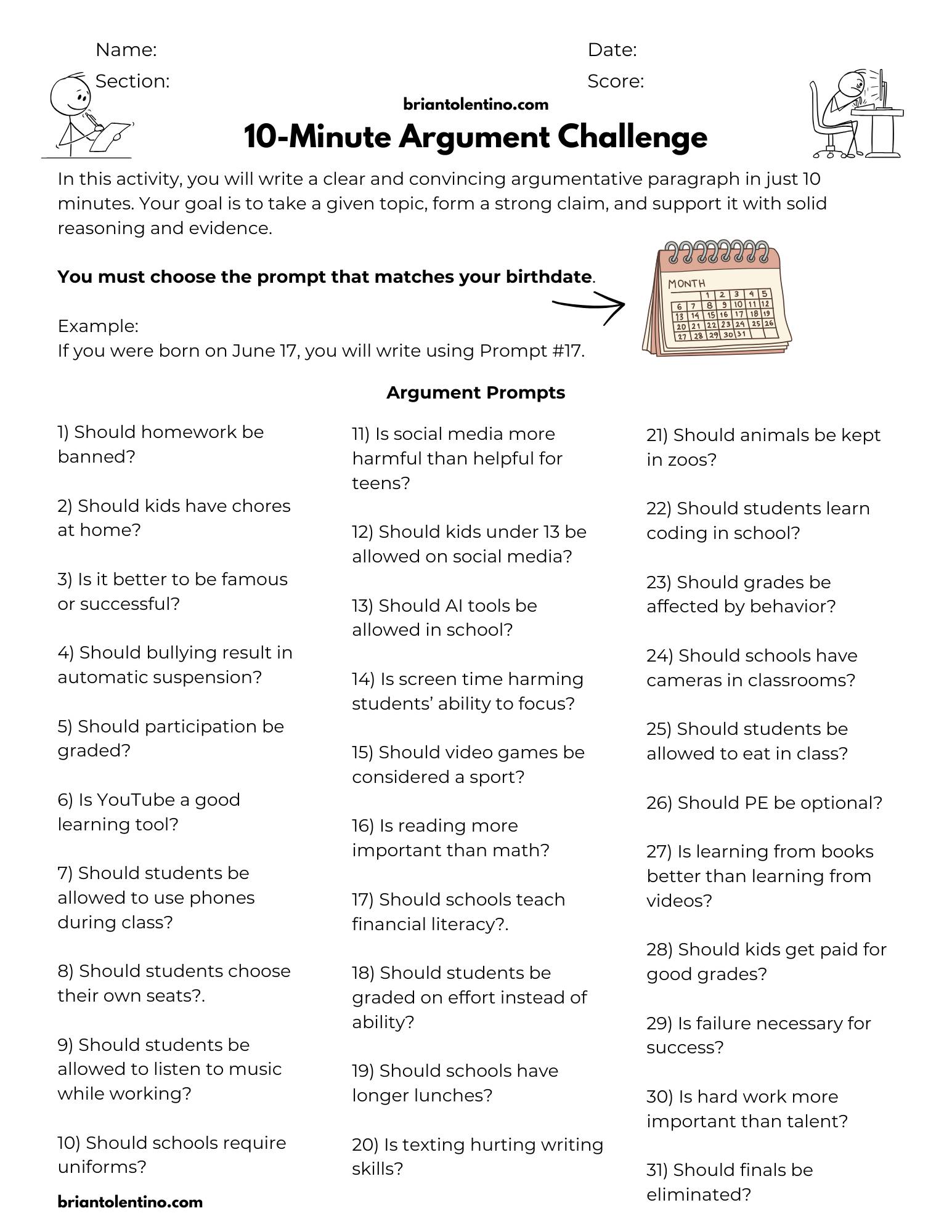 Hello Teachers, Here is a roundup of my newest resources. Enjoy! Hot Take Challenge! In this activity, you will be assigned a “hot take” to defend. Your task is to fully commit to the position you are given—even if you personally disagree. Challenge yourself to think critically, see different perspectives, and build the strongest argument possible. Hot Take Challenge! (Click Here) "Would You Rather" Challenge? "Would You Rather" Challenge (Click Here) 10-Minute Argument Challenge 10-Minute...